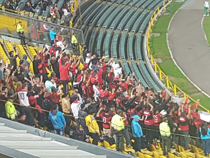 Torcida animada do Flamengo em Bogotá na Colômbia: