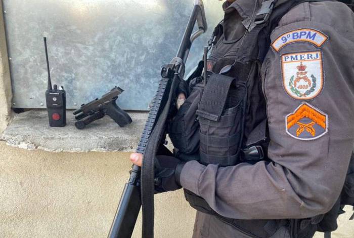 Pistola e radiotransmissor apreendidos na ação – Divulgação / Polícia Militar